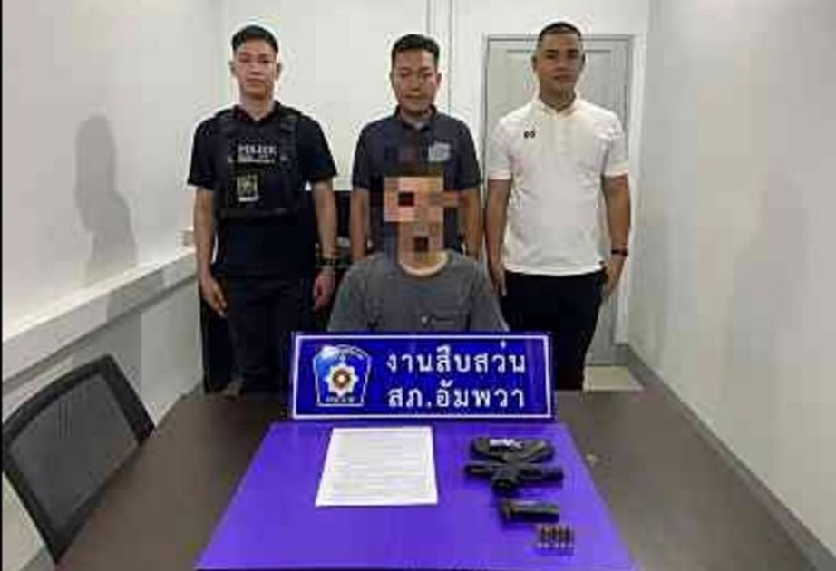วันที่ 16 พฤศจิกายน 2567 เวลา 00.10 น. พ.ต.อ.เพชรกล้า ทวีกาญจน์ ผกก.สภ.อัมพวา ,พ.ต.ท.ธนนท์ ล้นเหลือ รอง ผกก.สส.สภ.อัมพวา ,พ.ต.ท.สมชัย คงคานนท์ รอง ผกก.ป.สภ.อัมพวา ,พ.ต.ท.สมพงษ์ สาระกิจ สว.ป.สภ.อัมพวา ,พ.ต.ท.วัชระ พัฒนกุลอนันต์ สว.สส.สภ.อัมพวา พร้อมด้วยเจ้าหน้าตำรวจสภ.อัมพวา และเจ้าหน้าตำรวจ กก.สส.ภาค.จว.สมุทรสงคราม นำโดย พ.ต.ท.อิทธิพล กริสว่าง รอง ผกก.สืบสวน.ภ.จว.สมุทรสงคราม ได้ทำร่วมกันจับกุม อาวุธปืนพกสั้นแบบแม็กกาซีน สีดำ ยี่ห้อ ซิกซาวเออร์รุ่น p365 ขนาด 9 ม.ม. จำนวน 1 กระบอก ในข้อหา มีอาวุธปืนและเครื่องกระสุนปืนไว้ในความครอบครองโดยไม่ได้รับอนุญาต ณ ริมเขื่อนตรงข้ามร้านแดง หมูกระทะ ถนนริมแม่น้ำแม่กลอง ตำบลอัมพวา อำเภออัมพวา จังหวัดสมุทรสงคราม