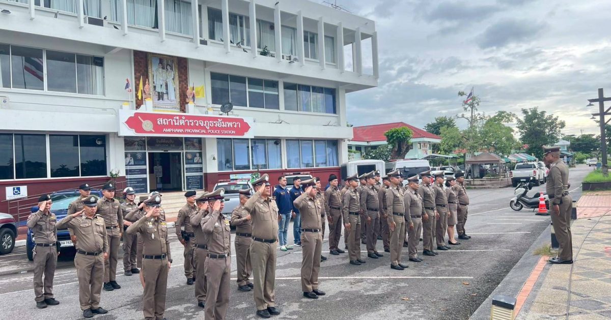 ข้าราชการตำรวจ สถานีตำรวจภูธรอัมพวา ร่วมพิธี เคารพธงชาติ สวดมนต์ กล่าวคำปฏิญาณตน อุดมคติตำรวจ และคำปลงใจของข้าราชการตำรวจ