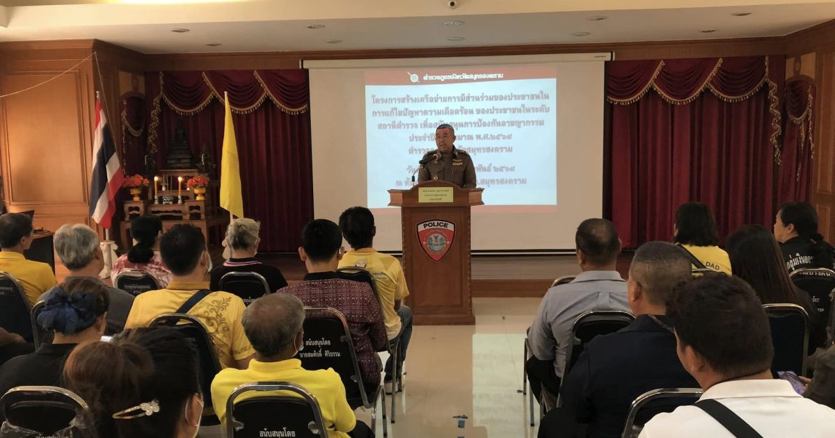 พ.ต.อ.สัณฑภวิษย์ มากช่วย รอง ผบก.ภ.จว.สมุทรสงคราม, พ.ต.อ.หญิงพรจันทร์ แก้วเลิศประเสริฐ ผกก.ฝอ.ภ.จว.สมุทรสงคราม, พ.ต.อ.ศยาม อินทร์สุวรรณโณ ผกก.สภ.เมืองสมุทรสงคราม, พ.ต.ท.ศุภศิษย์ วรรณเจริญ สวญ.สภ.ลาดใหญ่, พ.ต.ท.ศุภกร เจนอนุศาสตร์ สวญ.สภ.ยี่สาร พร้อม เจ้าหน้าที่ที่เกี่ยวข้อง ร่วม พิธีเปิดการอบรมโครงการสร้างเครือข่ายการมีส่วนร่วมของประชาชนในการแก้ไขปัญหาความเดือดร้อนของประชาชนในระดับสถานีตำรวจ เพื่อสนับสนุนการป้องกันอาชญากรรมประจำปีงบประมาณ พ.ศ.2568 ตำรวจภูธรจังหวัดสมุทรสงคราม โดยมี พล.ต.ต.สมภพ คูหาวิชานันท์ ผบก.ภ.จว.สมุทรสงคราม เป็นประธานในพิธี