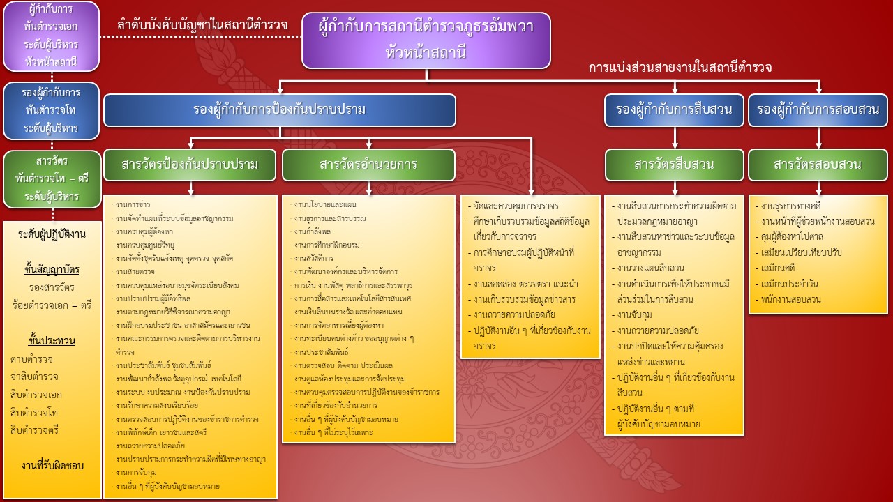 มีหน้าที่เกี่ยวกับการอำนวยการ การวางแผน การตรวจสอบติดตามและประเมินผลงานที่เกี่ยวกับนโยบาย ยุทธศาสตร์ และแผนงานของสถานีตำรวจ งานการบริหารบุคลากร งานจเรตำรวจงานกิจการพิเศษ งานความมั่นคง การศึกษา การฝึกอบรม งานวิชาการ สวัสดิการ การพัฒนา การบริหารจัดการ งบประมาณ การเงิน การพัสดุ การพลาธิการและสรรพาวุธ การส่งกำลังบำรุง รวมทั้งลักษณะงานอื่น ๆ ที่เกี่ยวข้องหรือเป็นส่วนประกอบของงานดังกล่าว เพื่อส่งเสริมหรือสนับสนุนการปฏิบัติงานของสถานีตำรวจ - งานป้องกันปราบปราม